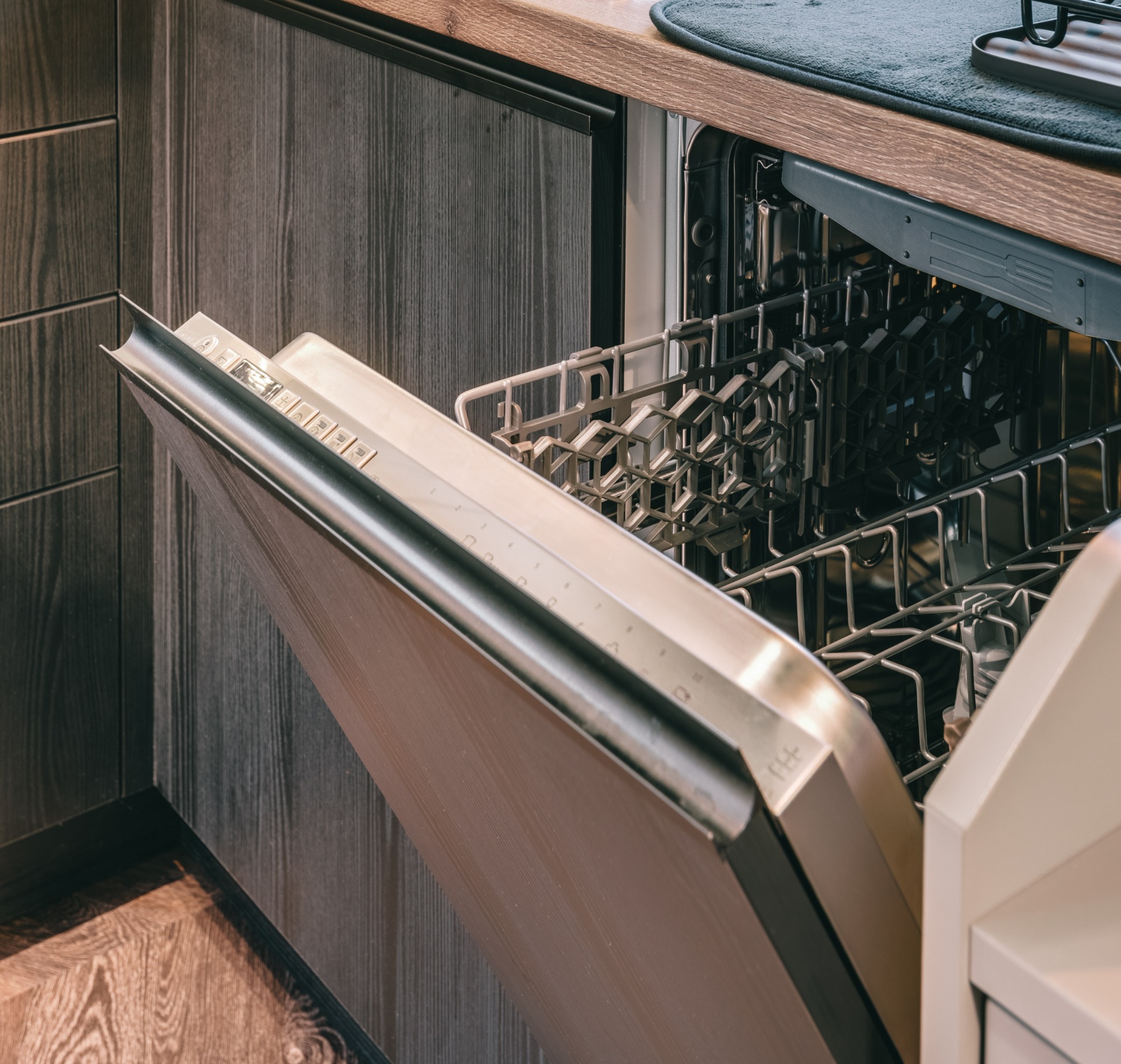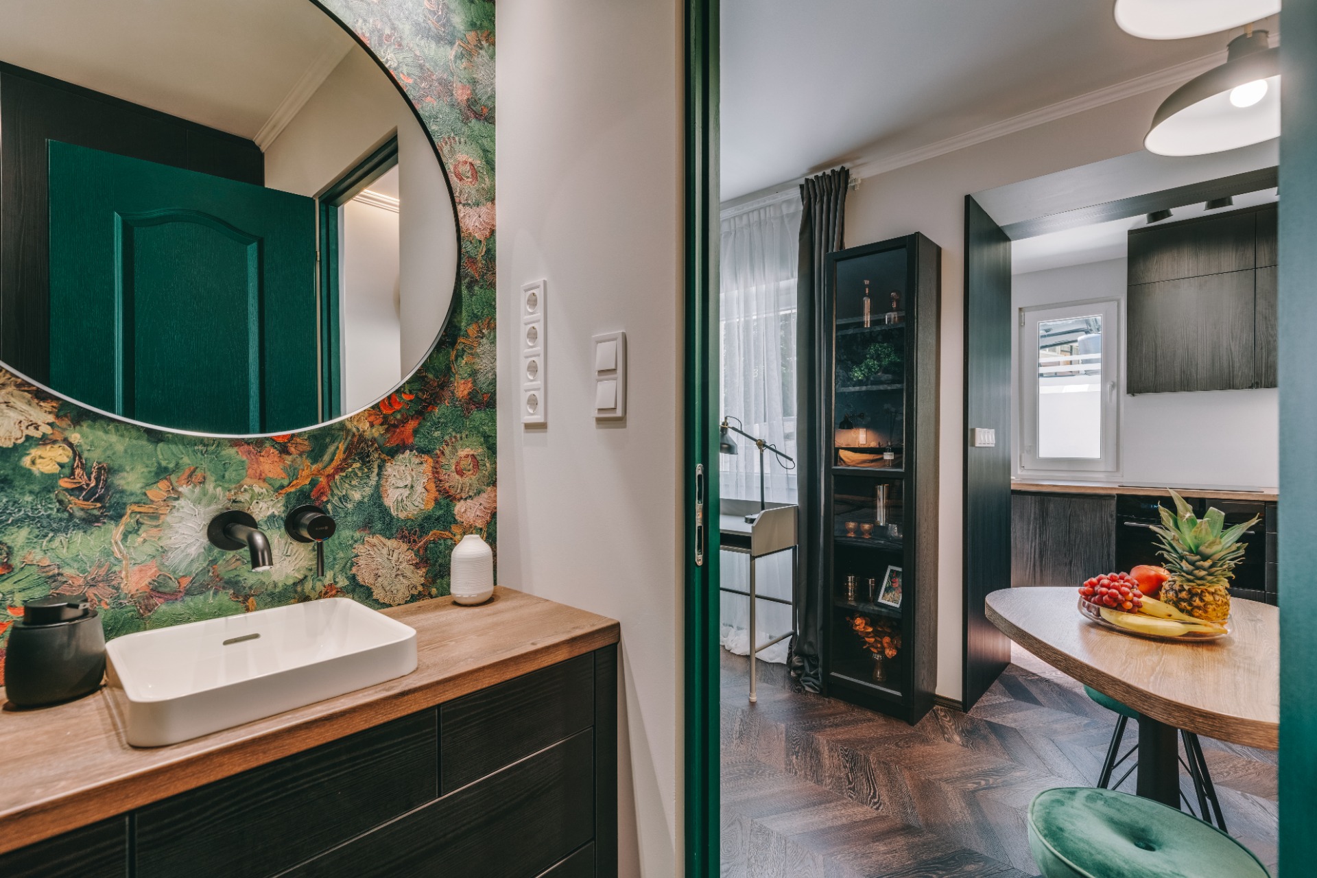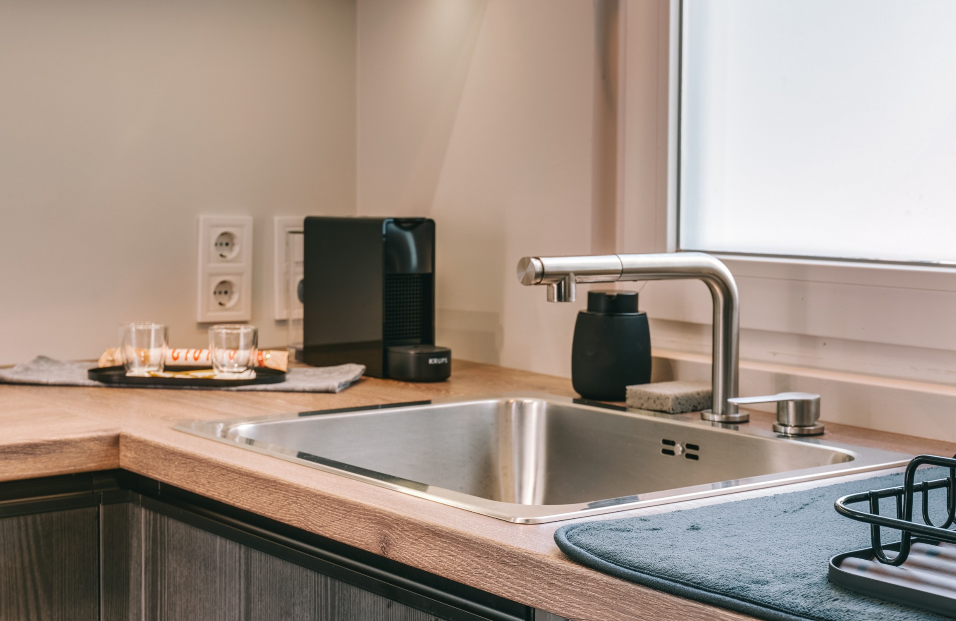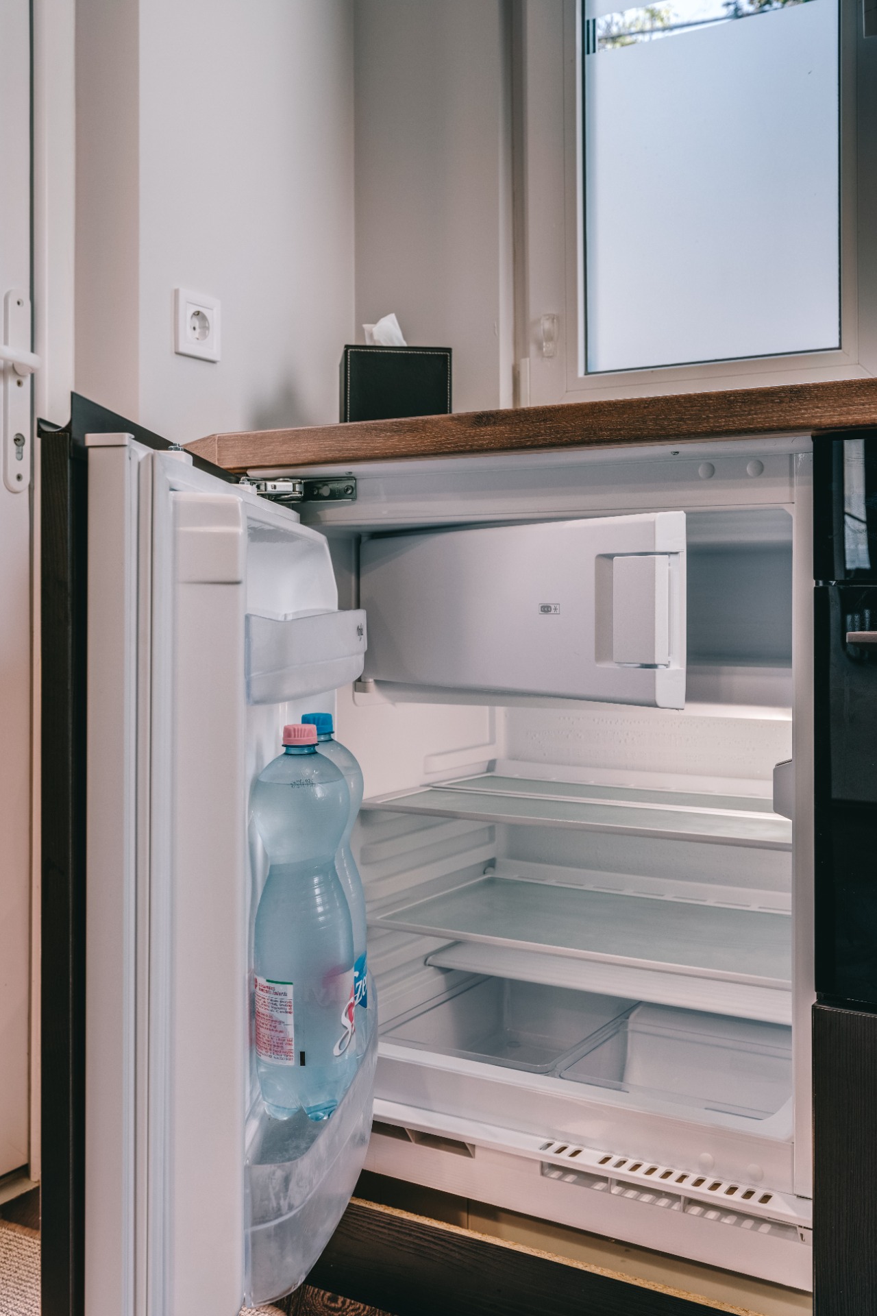 a felszerelt konyhában a vízforraló, kenyérpirító, kávéfőző (pár kapszulával, kávétejszínnel, édesítésre alkalmas kellékekkel) mellett nemcsak páraelszívó és főzőlap, de kombinált sütő (egyben mikró is), kis fagyasztórekesszel rendelkező hűtő (benne egy mentes és egy savas víz, hogy legyen hideg ital, amikor megérkezel) és mosogatógép is vár