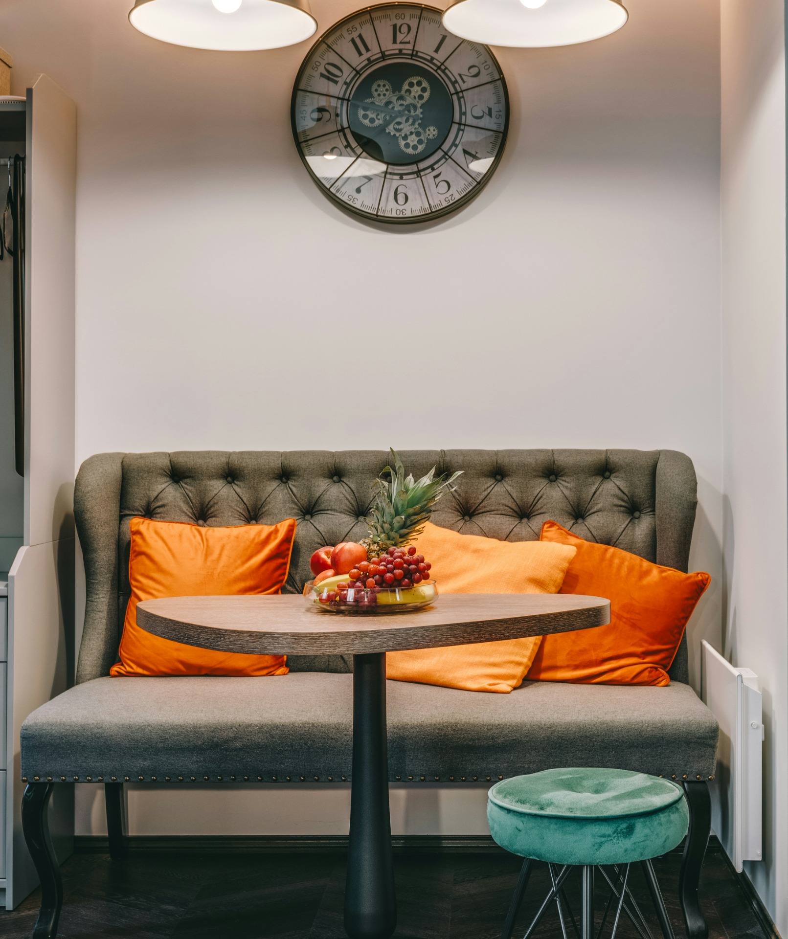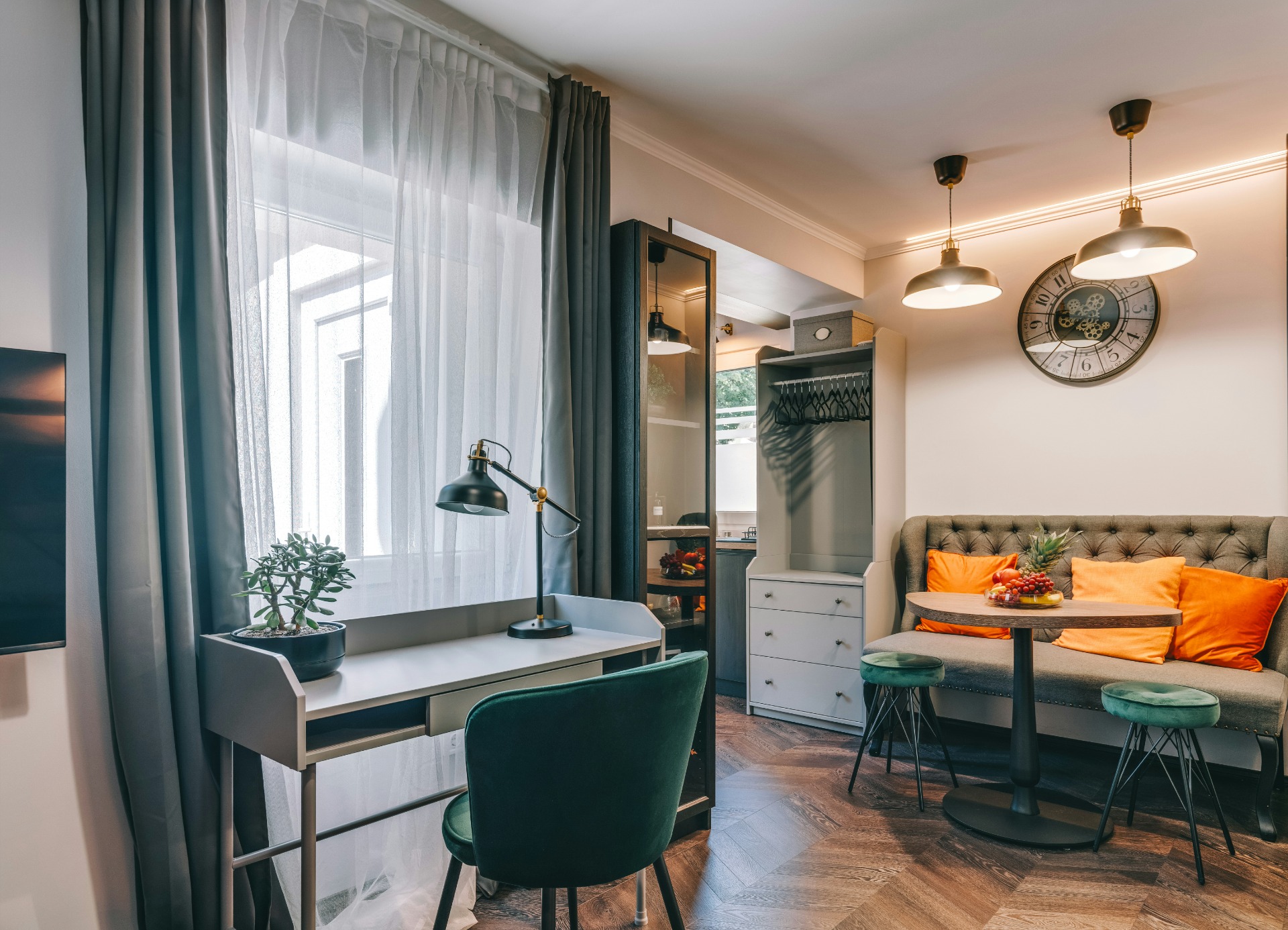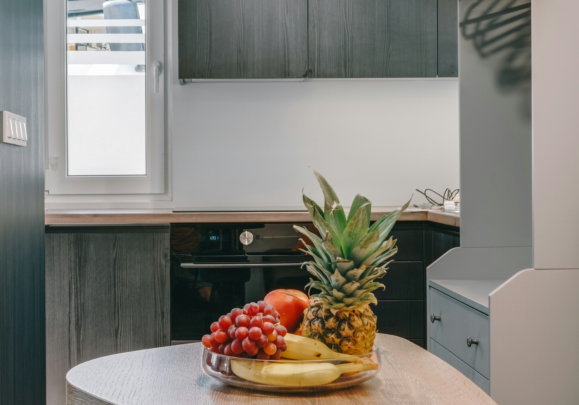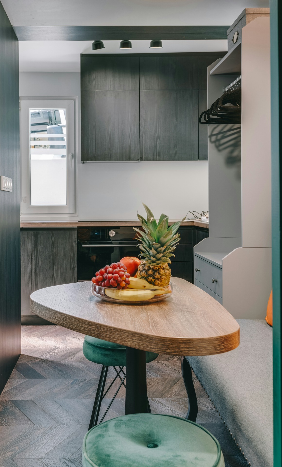 a felszerelt konyhában a vízforraló, kenyérpirító, kávéfőző (pár kapszulával, kávétejszínnel, édesítésre alkalmas kellékekkel) mellett nemcsak páraelszívó és főzőlap, de kombinált sütő (egyben mikró is), kis fagyasztórekesszel rendelkező hűtő (benne egy mentes és egy savas víz, hogy legyen hideg ital, amikor megérkezel) és mosogatógép is vár